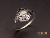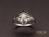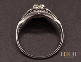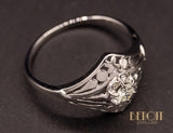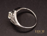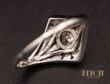 Bague en or blanc 750/1000e dont la tête de bague forme un losange bombé, découpé de formes géométriques et dont le centre est orné d'un diamant taille moderne d'environ 0,10 carat serti dans un chaton gaufré 6 griffes. Bijou original.
