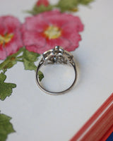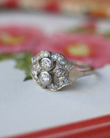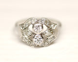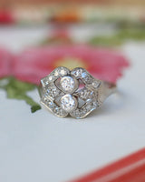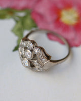 Bague Art Déco en platine 950 millièmes, au plateau finement composé de motifs géométriques en forme de volutes entièrement pavés de diamants taille moderne. En son centre, deux diamants taille moderne, sertis clos, apportent éclat et harmonie à l’ensemble. Son panier sobre et son corps de bague fin confèrent à cette pièce une allure délicate et pleine de grâce. Un bijou raffiné, en bon état.