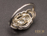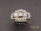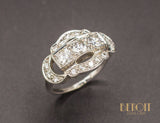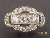 Bague de style et d'époque Art Déco, en or blanc 750/1000e ornée de trois diamants principaux taille moderne, sertis sur une bande d'or blanc rectangulaire, entourée d'éléments géométriques également sertis de diamants.