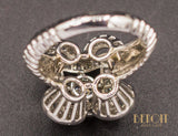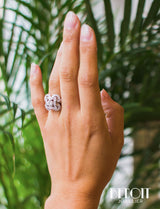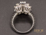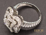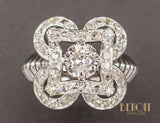 Bague composée d'un plateau Art Déco en platine orné en son centre d'un diamant taille ancienne d'environ 0,25 carat serti sur un chaton gaufré six griffes, entouré d'un carré incurvé et pavé de diamants, dont chaque coin est orné d'un diamant serti sur griffes, lui-même entouré d'un cercle pavé de diamants. Cet élément d'époque 1930 a été monté sur un corps de bague finement travaillé dans les années 1960, en or blanc 750/1000e, dont le travail de panier réalisé sur mesure est entièrement en fils et monté sur un corps de bague biseauté et godronné.