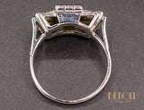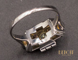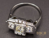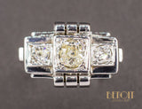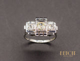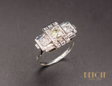 Bague en platine de style typique Art Déco, ornée en son centre d'un diamant jaune taille ancienne serti dans un carré accompagné de chaque côté d'un autre plus petit diamant blanc taille ancienne également serti dans un carré. Un tube coupé en trois encadre en haut et en bas le carré principal. Le plateau est soutenu en différentes hauteurs par un panier travaillé de formes géométriques. Corps de bague simple et plat. Travail annonçant l'arrivée de l'Art Déco Moderniste. Bijou au travail exceptionnel.