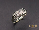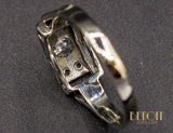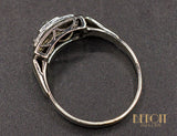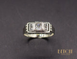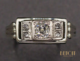 Bague fine en or blanc 750/1000e (18K) ornée en d'un diamant taille ancienne serti dans un carré surélevé au centre d'un rectangle où sont également sertis deux autres diamants taille rose de chaque côté. Le tout est entouré d'une bande d'or blanc soutenu par deux palmettes composées de trois brins. Joli panier délicatement décoré. Poinçon hibou.