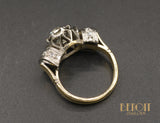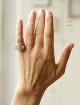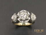 Bague Art Déco en or jaune 750 millièmes, ornée d'un diamant taille coussin taille ancienne en son centre, sertie par un chaton gaufré en platine rehaussé d'un panier ajouré. Il est épaulé de deux bandes serties de diamants taille ancienne. Joli détail de millegrain. Corps de bague demi-jonc.