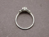 Bague Art Déco en platine et or blanc 750/1000e. Composée d'un diamant central estimé à environ 0,15 carat serti sur griffes et accompagné de part et d'autre d'éléments sertis de petits diamants taille rose. Le motif de la bague est entièrement en platine et l'anneau est en or blanc 750/1000e.