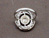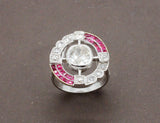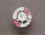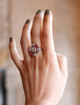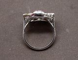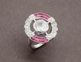 Bague Art Déco vintage des années 1930, dans le pur style de l'époque, en or blanc 750/1000e. En son centre est serti, en clos, un diamant coussin taille ancienne estimé à environ 1,20 carat. L'entourage est une alternance de diamants et de calibrés sur deux rangs. On remarque aussi quatre diamants taille ancienne sertis sur des carrés d'or blanc en relief, séparant les parties diamants des parties rubis verneuil. L'anneau de la bague est également serti de diamants de part et d'autre du motif principal. Le panier de la bague est ouvragé de cercles et d'arabesques.