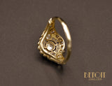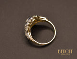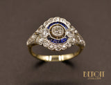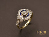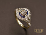 Bague Art Déco en or jaune 750 millièmes dont la totalité du plateau est réhaussé de platine et travaillé dans un style floral. Au centre, un diamant taille ancienne est serti en clos, il est entouré de saphirs calibrés puis orné de plusieurs diamants taille ancienne. Le plateau est terminé par deux légers godrons avant le corps de bague simple en demi-jonc. Le travail est très fin, fait de détails de jours et de millegrain typique de cette période.