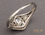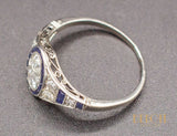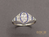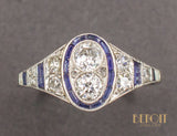 Bague ancienne en or blanc 750/1000e dont la tête de bague est entièrement réhaussée de platine. Au centre, deux diamants taille ancienne sont sertis en clos, accompagnés de deux petits diamants taille rose et entourés d'un ovale de saphirs bleus calibrés. De part et d'autre, l'anneau en fuite rappelle la forme d'une chevalière. Il est serti de diamants et de baguettes de saphirs sur tout le dessus du doigt. Flancs ouvragés d'arabesques. Bijou de très belle facture.