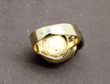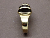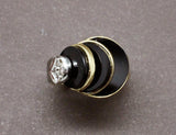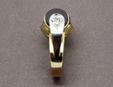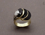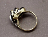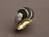 Bague vintage Art Déco moderniste des années 1940, en or jaune 800/1000e (19K). Ornée de trois disques d'or surmontés d'onyx, de dimensions décroissantes, placés de différentes inclinaisons sur le dessus de la bague. Sur ceux-ci s'appuie un élément d'or blanc serti de 4 petits diamants. Bijou au design d'époque Art Déco Moderniste, très géométrique.