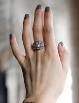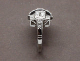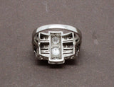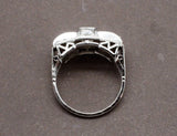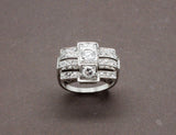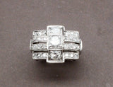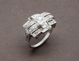 Bague en platine Art Déco vintage, composée de divers volumes pavés de diamants. Le panier sur le côté de la bague est ouvragé de formes en zig-zag. Le design de la bague est typique de la période Art Déco des années 1930.