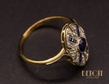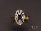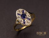 Bague de style Art Déco en or jaune 750/1000e dont la tête ovale, surmontée d'or blanc 750/1000e, est sertie en son centre d'un saphir bleu roi taille ronde serti dans un clos et d'où partent en croisés deux barres de saphirs calibrés. Les vides sont sertis de diamants taille rose. Travail de millegrain sur tout le serti. Le corps de bague est orné de chaque d'un fer de lance surmonté d'or blanc. Bijou fin et délicat.