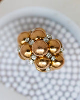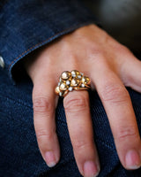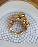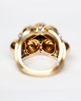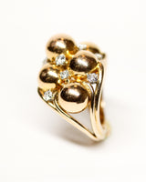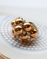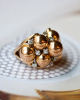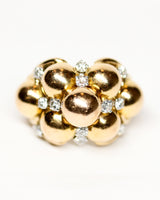Bague Dôme en or rose 750 millièmes composée d'un bel assemblage en pyramide de 7 perles d'or creuses, ponctuée entre chaque de Diamants taille brillant (estimés ~ H-Si) sertis griffes en or blanc. Le corps de bague se compose de quatre fils joins en bas de bague et se séparant en tête en entourage. Bague en bon état.