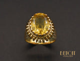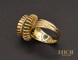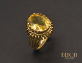 Bague Cocktail en or rose 750/1000e typique des années 1950 avec son joli travail de fils. Le panier fait de nombreux fils ronds semble maintenu par une torsade tout autour des griffes. Au centre, une belle citrine d’environ 5 carats orne la bague. Anneau large en fuite, godronné.