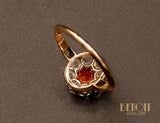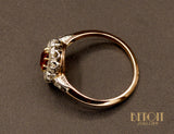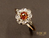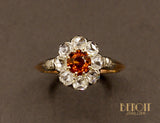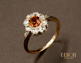 Bague marguerite en or rose 750 millièmes sertie d'une jolie citrine orange sur huit griffes, entourée de diamants taille rose sertis sur chatons couronnes de platine. De part et d'autre, deux diamants sertis sur réhaut de platine débutent le corps de bague biseauté.
