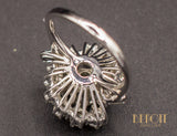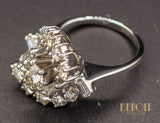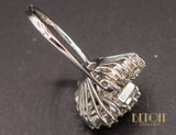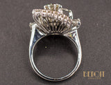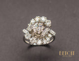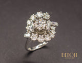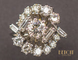 Bague en or blanc 750/1000e de style cocktail, ornée d'un diamant central taille moderne d'environ 0,50 carat serti sur huit griffes, entouré de diamants ronds et diamants baguettes de différentes dimensions, sertis sur griffes à différentes hauteurs. Bijou haut, sur un panier en fil, typique des bagues cocktails des années 1960-70.