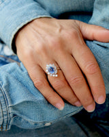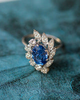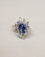 Bague Cocktail en Or Blanc 750 millièmes, serti au centre d'un Saphir Ovale Bleu clair ~3.0 cts par 6 griffes, bordé d'un côté par une ligne courbe de 6 Diamants Ronds taille moderne (estimé ~ G-Vs) serti en griffes; puis de l'autre côté une ligne courbe de 5 pétales, pavés chacun d'un Diamant rond moderne (estimé ~ G-Vs) en serti clos et grains. Bijou en excellent état.