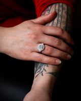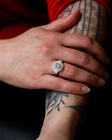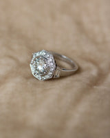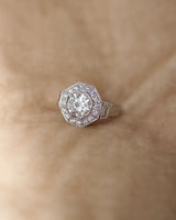 Bague création Benoit Joaillier de forme octogonale, en or blanc 750/1000e avec en son centre un diamant rond taille moderne de 1,22 carat certifié HRD (G-SI2) , serti en clos, entouré de diamants sertis en grains sur une forme octogonale, et épaulé de deux diamants trapèze. Corps de bague simple section carrée, joli panier repercé.