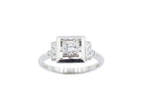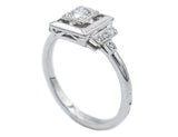 Bague Création Benoit Joaillier en or blanc 750/1000e, sertie en son centre d'un diamant de 0,20 carat certifié H-VS1, dans un carré au centre d'un entourage lisse et épaulé de deux escaliers pavés de diamants.