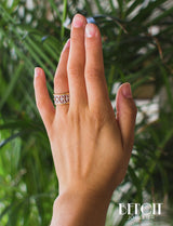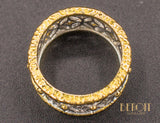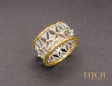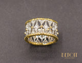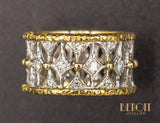 Bague large ajourée en or blanc 750/1000e, sertie de diamants, agrémentée de billes d'or jaune 750/1000e. Deux bandes d'or jaune viennent encadrer la partie en or blanc. Bijou de très belle facture.
