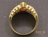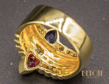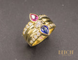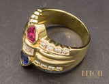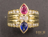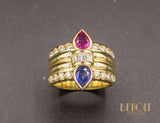 Bague en or jaune 750/1000e formée en son milieu de deux godrons épaulés par 8 diamants de part et d'autre. Au centre, un motif est composé d'une bande de diamants taille baguettes sertis en rails et accompagné en haut et en bas d'une poire de rubis et de saphir sertis en clos.