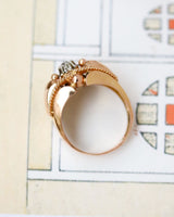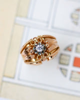 Bague en or rose 750/e, dans le pure style des années 1950, formée de différents volutes et de fils torsades, faisant monter le bijou en hauteur, dont le centre est orné d'un diamant taille moderne (légèrement ébréché, estimé ~H-Si) serti griffes sur chaton gaufré en or blanc 750/e. Corps de bague large en fuite. Bijou de très belle facture.