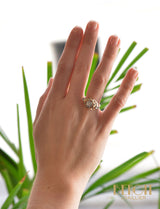 Bague en or rose 750/1000e ornée en son centre d’un diamant taille brillant serti sur un chaton gaufré de platine. Tout autour, des spirales viennent soutenir le chaton et sont terminées de diamants taille rose en clos de platine.De chaque côté, 3 diamants taille rose sont sertis sur une goutte de platine. Bijou de belle facture.