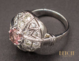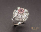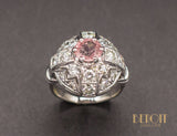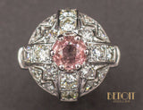 Bague Art Déco dont la tête de bague, en platine, forme un dôme ajouré de zig-zags, sertie de diamants, avec en son centre une tourmaline rose d'environ 0,90 ct sertie sur 6 griffes. L'anneau de la bague, en or blanc 585/1000e, est agrément de godrons de chaque côté de la tête de bague.