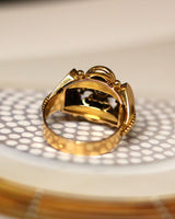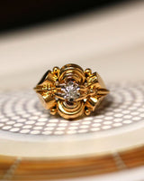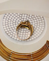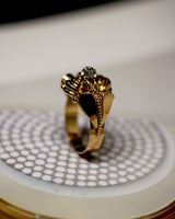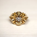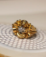Bague en or jaune 750/1000e dont la tête est composée d'un motif de fleur en godron formant un dôme, au centre duquel un diamant taille ancienne est serti sur un chaton gaufré 6 griffes en platine. Palmettes représentant une tige en perle d'or avec deux feuilles de part et d'autre. Corps large et plat. Bijou de belle facture en très bon état.