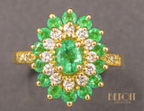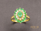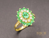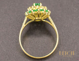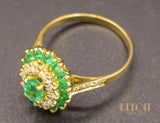 Bague en or jaune 750/1000e ornée d'une émeraude ovale d'environ 0,40 carat sertie sur quatre griffes, accompagnée d'un premier entourage de 12 diamants, puis d'un second d'émeraudes, le tout serti sur griffes. De part et d'autre de la tête de bague, l'anneau est serti de diamants.