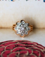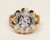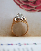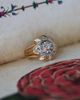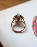 Bague Dôme de style Marguerite en or rose 750/e constituée de différentes formes géométriques superposées représentant une fleur dont le centre est orné d'un diamant taille moderne serti griffes hautes sur chaton gaufré en clos et entouré par une première couronne de pétales chacun pavé de diamant taille rose, l'ensemble en platine et posé sur une deuxième couronne en forme de pétales. Le corps de bague se compose de quatre fils torsadés se rejoignant sur le bas et partant en éventail pour soutenir la tête. Très bel ouvrage en très bon état.