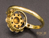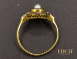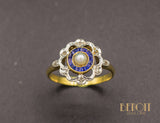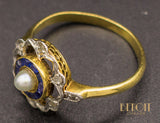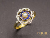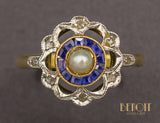 Bague en or jaune 750/1000e décorée d'un beau panier ouvragé réhaussé de platine. Plateau finement travaillé serti de diamants taille rose, dont le centre est orné d'une perle fine blanche de 3 millimètres de diamètre, entourée d'un rang de saphirs calibrés d'un bleu profond. Bijou fragile.