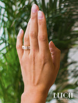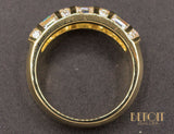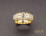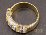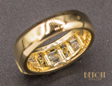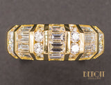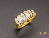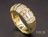 Bague jonc en or jaune 750/1000e au style géométrique rappelant la période Tank mais de fabrication récente. Sur une section aux pans coupés, elle est sertie aux trois quarts d'une succession de motifs de diamants sertis en rail : quatre diamants brillants puis quatre diamants calibrés. Bijou épuré.