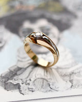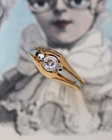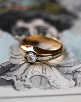 Solitaire Moderniste composé d'un solitaire en or blanc 750/e, orné d'un Diamant taille ancienne en serti en clos, encadrée, de part et d'autre, par un anneau en or jaune, finalisant la monture.