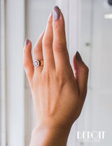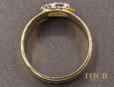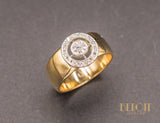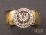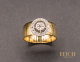Bague en or jaune 750/1000e de type jonc large, dont la tête de bague est composée de deux cercles de platine concentriques sertis de diamants taille rose. Bijou mixte.