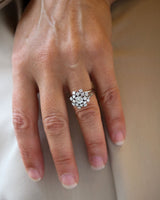 Bague Marguerite en or blanc 750/e de type dôme dont le centre est orné d'un diamant taille moderne (estimé G/H-SI° serti griffes hautes entouré de diamants taille brillant sertis griffes haute, montés en quinconce. Le corps de bague se compose de trois fils se rejoignant sur le bas et partant en éventail pour soutenir la tête. Bijou avec un très bel équilibre en très bon état.