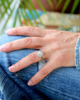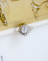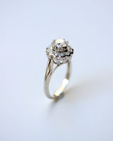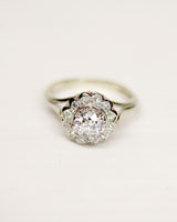 Bague Marguerite en or blanc 750/e, ornée au centre d'un Diamant taille ancienne (estimés ~H/I Si) sertis 8 griffes, entouré de douze pétales sertis chacun d'un Diamant taille ancienne en clos. Panier ajouré en couronne. Corps de bague formé de trois fils donc donc le central plus épais se termine par les palmettes en forme de feuille allongée. Bijou en bon état.