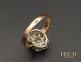 Bague en or rose 750 millièmes ornée en son centre d'un diamant taille coussin taille ancienne d'environ 0,60 ct, entouré de huit diamants également taille ancienne, le tout serti par des griffes d'argent. Corps de bague ruban, joli panier dentelé.