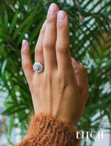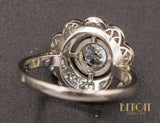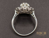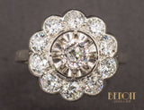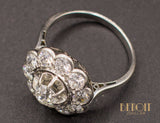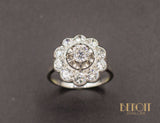Bague en platine de style marguerite ornée en son centre d'un diamant taille ancienne d'environ 0,40 carat serti sur un chaton gaufré 8 griffes entouré de 10 diamants taille moderne sertis en grains. Bijou de très belle facture.