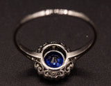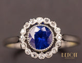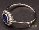 Bague marguerite en platine datant des années 1920 ornée en son centre d'un saphir bleu taille ronde de 1,08 carat serti en clos millegrainé au milieu d'un entourage de diamants sertis également en clos millegrain. Panier travaillé d'arabesques. Corps de bague fin. Très beau bijou, recherché.