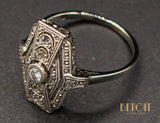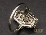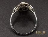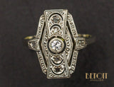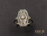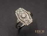 Bague en or blanc 750/1000e ornée d'un plateau finement ouvragé et ajouré de motifs géométriques sertis de petits diamants taille rose. Au centre est serti un diamant taille brillant d'environ 0,05 carat en clos millegrainé. Le panier est travaillé de tubes et le corps de bague est simple et fin. Bijou délicat, typique Art Déco. Poinçon hibou.