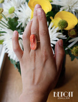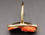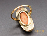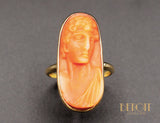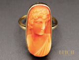 Bague en or jaune 375/1000e (9K), ornée d'un camée en corail de forme ovale allongée serti en clos, représentant un homme de 3/4, aux cheveux bouclés et habillé d'un pagne, fortement inspiré des représentations de l'Antiquité grecque. Anneau simple. Fabrication certainement étrangère.