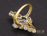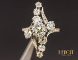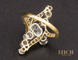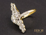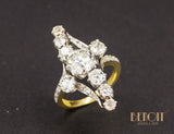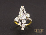 Bague ancienne de forme navette en or jaune 750/1000e et platine. En son centre un diamant taille ancienne d'environ 1,5 carat est serti dans un chaton gaufré 8 griffes de platine. Il est accompagné en diagonale de deux diamants taille ancienne d'environ 0,20 carat sertis dans des chatons quatre griffes. Sur l'autre diagonale, deux diamants similaires sont sertis dans des chatons 8 griffes et prolongés dans une courbe par deux autres diamants taille ancienne de taille dégressive. Des arabesques pavées de diamants taille rose soulignant la forme générale et la relie au corps de bague en or jaune. Poinçon cheval. Très beau bijou.