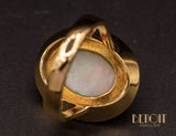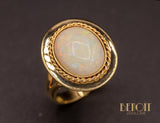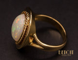 Bague en or rose 750/1000e ornée en son centre d'un cabochon d'opale blanche serti dans un clos souligné d'un fil torsadé, posé sur un plateau ovale épuré. Corps de bague épais, demi jonc, se séparant en deux au niveau de la tête. Bijou d'inspiration XIXe.