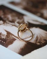 Bague Art Nouveau en or Jaune et Blanc 750 millièmes, ornée au centre d'une Opale de taille cabochon ovale sertie en clos agrémenté de millegrain, accompagnée d'un entourage de diamants taille rose sertis sur Or Blanc. Panier ajouré et ouvragé. Palmettes en forme de feuille pavée d'un diamant taille rose. Corps de bague Fin. Bijou en parfait état.