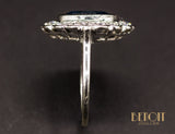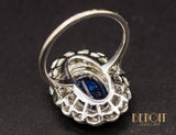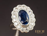 Bague pompadour ancienne en or blanc 750/1000e, ornée en son centre d'un saphir bleu ovale d'environ 2 carats serti dans un clos et entouré de diamants taille brillant sertis en grains. Panier travaillé de repercés en forme d'écailles.