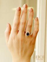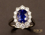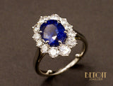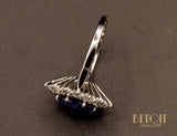 Bague en or blanc 750 millièmes dont la tête de bague est ornée d'un saphir ovale d'un bleu intense et lumineux serti sur six griffes. Tout autour, sont sertis des diamants taille moderne en chute symétrique, sertis sur griffes, supportés par un panier de fils. Corps de bague sobre en demi-jonc. Très beau classique de la bague entourage.