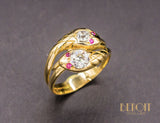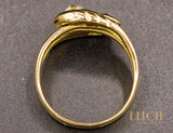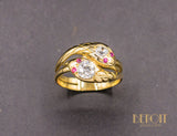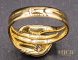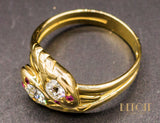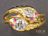 Bague de la fin du XIXe siècle en or jaune 750/1000e (18K) formée de deux serpents s'enroulant sur le doigt, et dont les têtes sont chacune serties d'un diamant taille ancienne, l'un rond taille ancienne d'environ 0,55 carat estimé I-I et le deuxième coussin taille ancienne d'environ 0,20 carat estimé K-I. Les yeux des deux têtes sont symbolisés par de petits rubis. Travail de gravure symbolisant les écailles. Très beau bijou, recherché et typique de l'époque, symbolisant la fidélité.