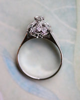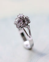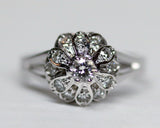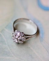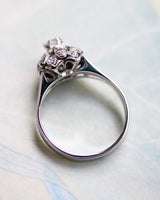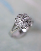 Bague Marguerite Or Blanc 750 millièmes représentant une fleur, dont le centre est serti d'un Diamant Taille Brillant sur six griffes, entouré de douze pétales ornés chacun d'un Diamant taille brillant serti grain. Panier fil et palmettes en V. Corps en ruban. Bague en bon état.