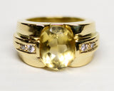 Bague en or jaune 750/1000e de style Tank, centrée d’une citrine ovale jaune pâle, maintenue en serti tension, de chaque côté, par deux godrons pavés de diamants qui soulignent la pierre centrale. Un bijou au design structuré, en bon état.