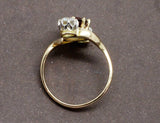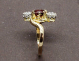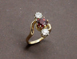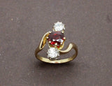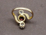 Bague style tourbillon vintage du XIXe siècle en or jaune 750/1000e. Son motif principal est composé de trois pierres alignées. Au centre, un grenat rouge estimé à environ 1,20 carat est serti sur 8 griffes et accompagné de deux diamants d'environ 0,35 carat chacun, sertis dans deux chatons de platine.
