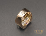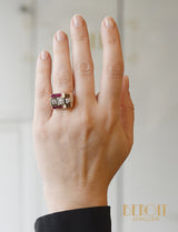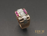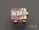 Bague Tank en or rouge 750/e et platine, le dessus est asymétrique, d'un côté un rouleau rehaussé d'un godron en platine serti de diamants taille ancienne, suivi par un escalier de deux carrés en platine serti en grains de deux diamants 8/8 taille ancienne, eux-mêmes se trouvant au centre de deux rangs de rubis Verneuil en rail. Corps de bague large, tête de bague évidée pour plus de légèreté.